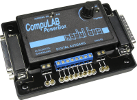 | Die PowerBox verstärkt die digitalen Ausgänge des SIOSLAB Interface. Bei einer einstellbaren Ausgangsspannung für den High-Zustand von 5 V bis 12 V kann jeder Ausgang einen Strom von maximal 600 mA liefern. Der Gesamtstrom aller Ausgänge wird durch das am Interface angeschlossene Netzteil begrenzt und darf 2 A nicht übersteigen. Die Anschlüsse für die verstärkten Ausgänge, die einstellbare Ausgangsspannung und Masse sind als Schraubklemmen und Buchsen für Miniaturlaborstecker ausgeführt. Der Anschluss der CompuLAB PowerBox erfolgt am Sammelanschluss der Interfaces, wobei das Gerät einen neuen Sammelanschluss zur Verfügung stellt. |